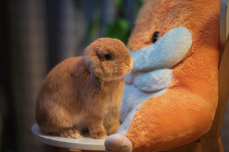 小兔與毛絨熊相伴
