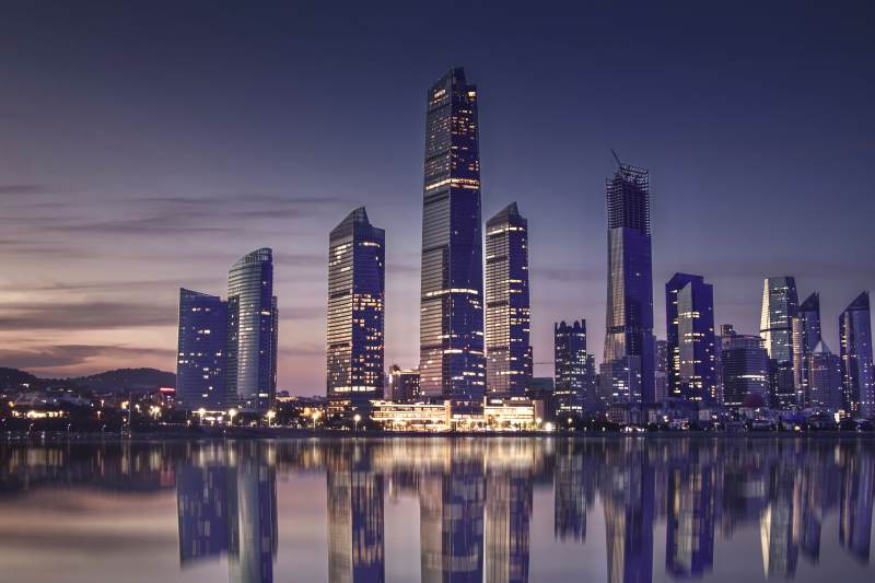城市夜景 高樓大廈 燈光璀璨 港口 帆船 黃昏 天際線 現(xiàn)代建筑 水面倒影 城市景觀