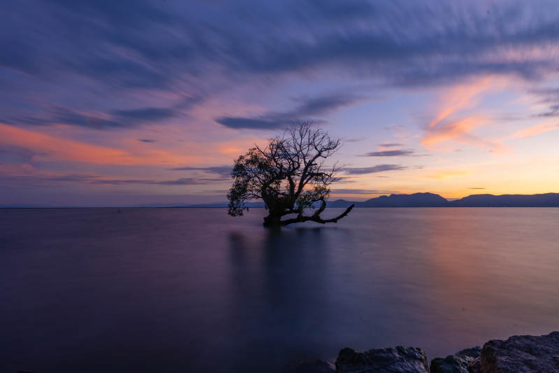 湖畔孤樹映霞光