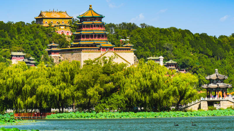 頤和園紅墻黃瓦映藍天