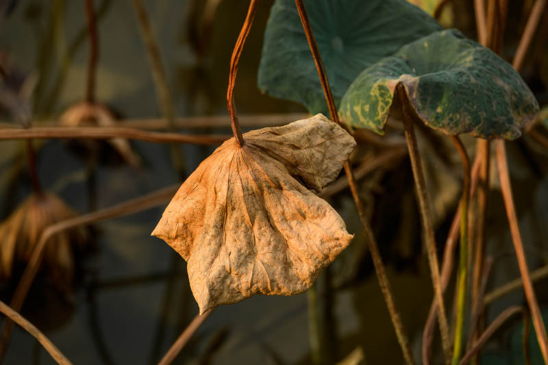 枯萎荷葉垂掛水邊