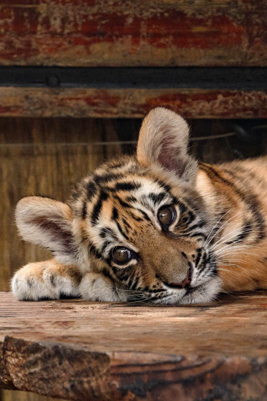 虎崽靜臥木臺