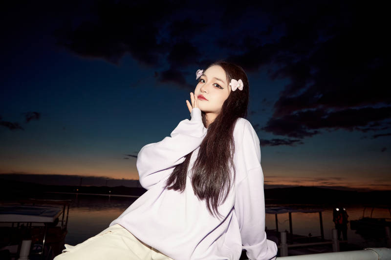 傍晚在湖邊欣賞風景拍照的亞洲美女