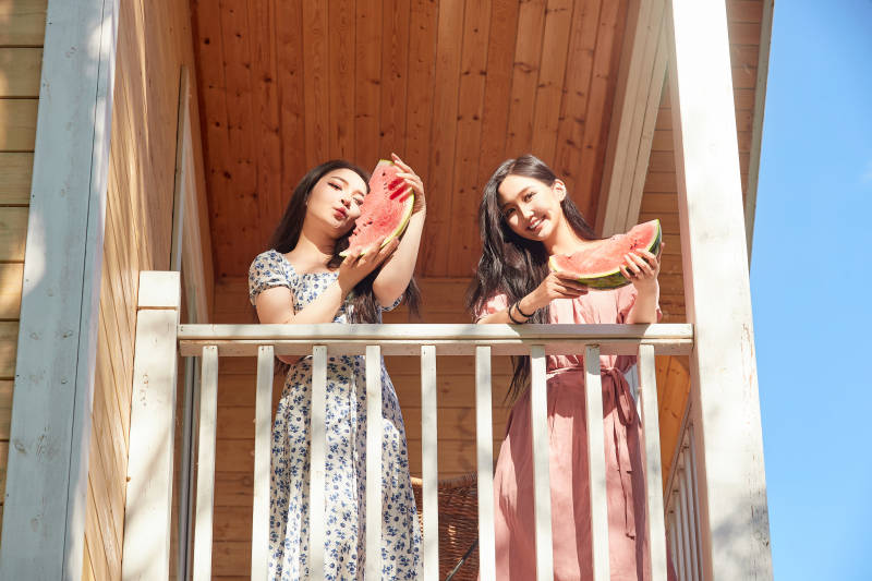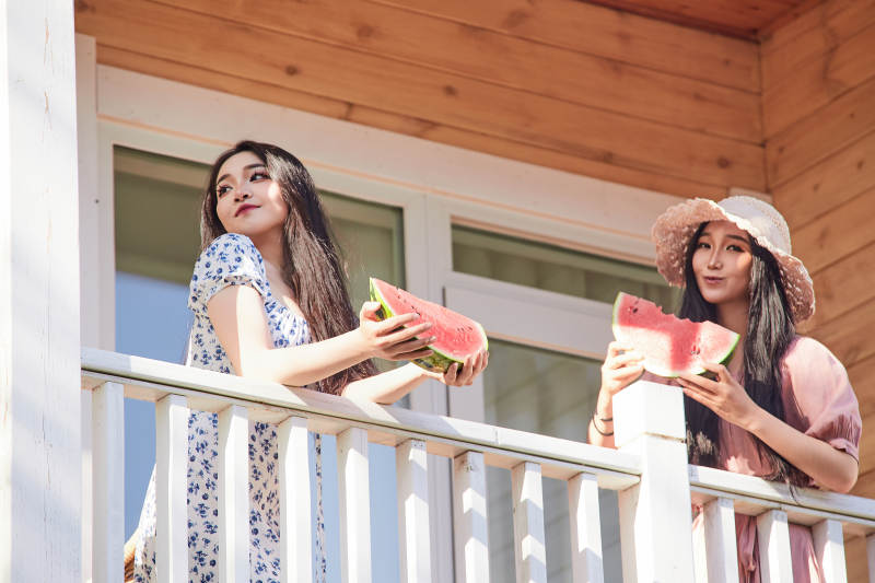 夏天在木質(zhì)別墅門廊外吃西瓜的美女