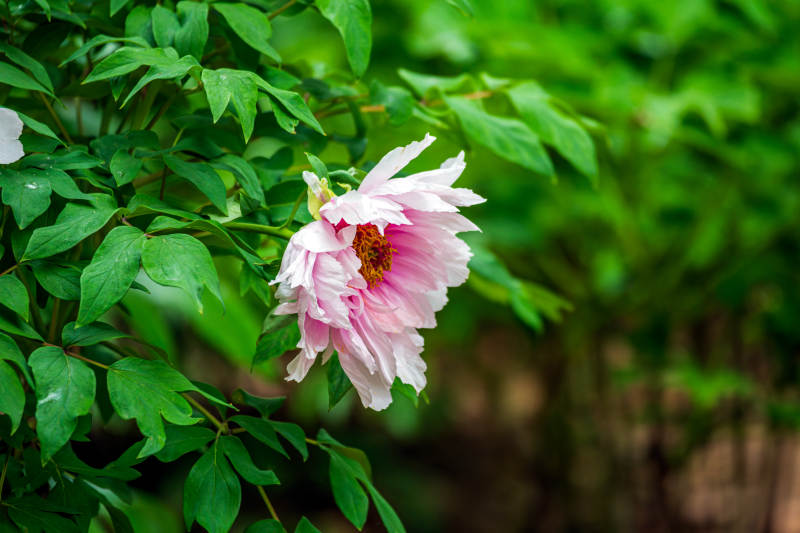 粉色牡丹花綻放于綠葉間