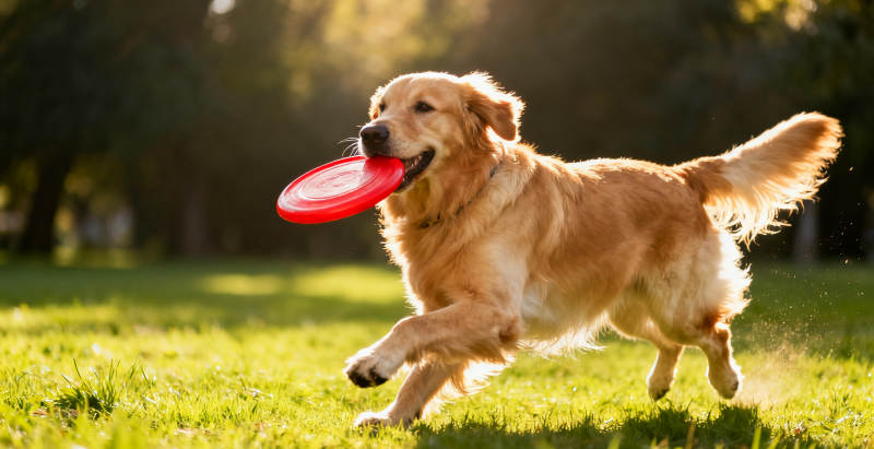 金毛犬叼飛盤奔跑